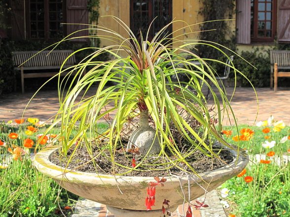 צמח פיסולי ומיוחד. עץ קטן, בצעירותו מתאים לגודל של שיח עם עלווה דמויית זנב סוס, מכאן שמו באנגלית ponytail palm, בעלת אופי של דקל, עלים צרים, סרגליים, ירוקים וארוכים דמוי מזרקה. בבגרותו גדל ומגיע לגדלים שמאפיינים עצים נמוכים. העלים הצרים יגיעו לאורך מעל מטר . גזע מעניין, מעין כדור שחציו שתול באדמה וחציו חשוף מעל הקרקע. פריחה תופיע בצמח בוגר, גדולה מאוד, צצה מראש העץ, ממרכז מזרקת העלים - הרבה עמודי פריחה עם פרחים קטנטנים בגוון קרם בהיר, מעוצבים גם הם כמו מזרקה. העץ מאוד קישוטי ומתאים למיכל או מקום בולט בגן כצמח מוקד. יש השותלים 2 או 3 צמחים יחדיו. העץ אינו אוהב השקיה מרובה, הוא חסכוני במים ומתאים לתחזוקה מועטה. הצמח הוא טרופי, רגיש לאזורים קרים.