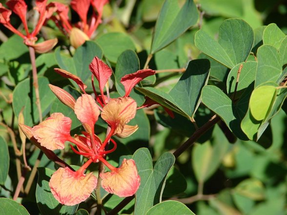 שיח בינוני גדול, מטפס נשען או עץ קטן, רב שנתי ונשיר מותנה. אוורירי בעל עלים פשוטים שמחולקים ל - 2 אונות, שמתקפלות לאורך העורק המרכזי. הפרחים מיוחדים, עלי הכותרת פרוסים, דומים לכנפי פרפר, כתומים אדמדמים. ניתן לגזום את הצמח באביב מדי שנתיים, לעצב גזע, ואף להפכו למטפס נשען, מגיב מצויין לגיזום. הצמח ישמח לדישון ואף להשקיה מוגברת.