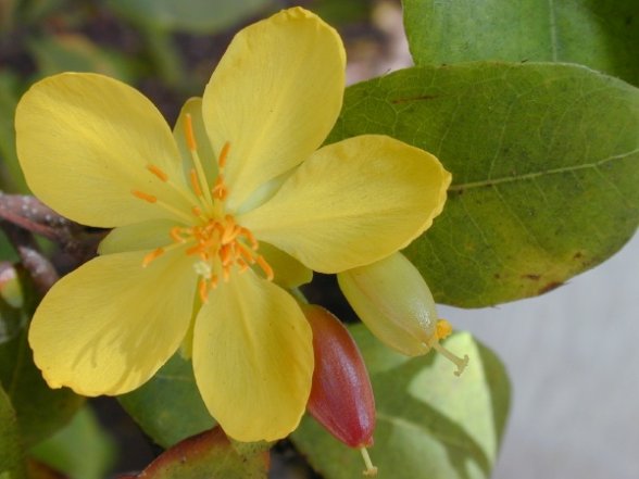 שיח רב שנתי נשיר. פורח בצהוב זוהר, ולאחר מכן הצמח מלבלב באביב בגווני ורוד ברונזה. העלים פשוטים מאורכים מעט ומשוננים. הפרח הןפך לפרי הידוע בכינויו -מיקי מאוס. מספר כדורים ירוקים, מתחת לעלי הכותרת האדומים, כשמתייבשים משחירים. בצעירותו זקוק להשקיה בינונית ולאחר מכן השקיה מועטה.