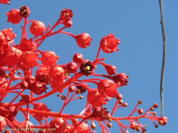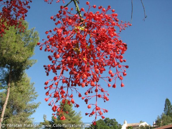 עץ ירוק עד או נשיר מותנה, חסון ועמיד למחלות, במבנה פירמידה. יחודו בצבעו האדום בעת הפריחה, נראה כשלהבת אש אדומה. העלים מלבלבים באדום לאחר הפריחה. גובהו עד כ-12 מטר ורוחבו עד כ- 8 מטר. גודל העץ תלוי בכמות ההשקיה. אשכולות פרחים קטנים דמויי פעמון, בצבע אדום בוהק. הפירות בצורת סירה, שלאורכה הזרעים, בגוון חום שחור, קישוטיים. העלים בעלי אונות. העלים פשוטים, מבריקים עם שפה תמימה. השורש שיפודי, לכן מתאים לשתילה במקומות קטנים. מעדיף קרקע מעט חומצית עד בסיסית.